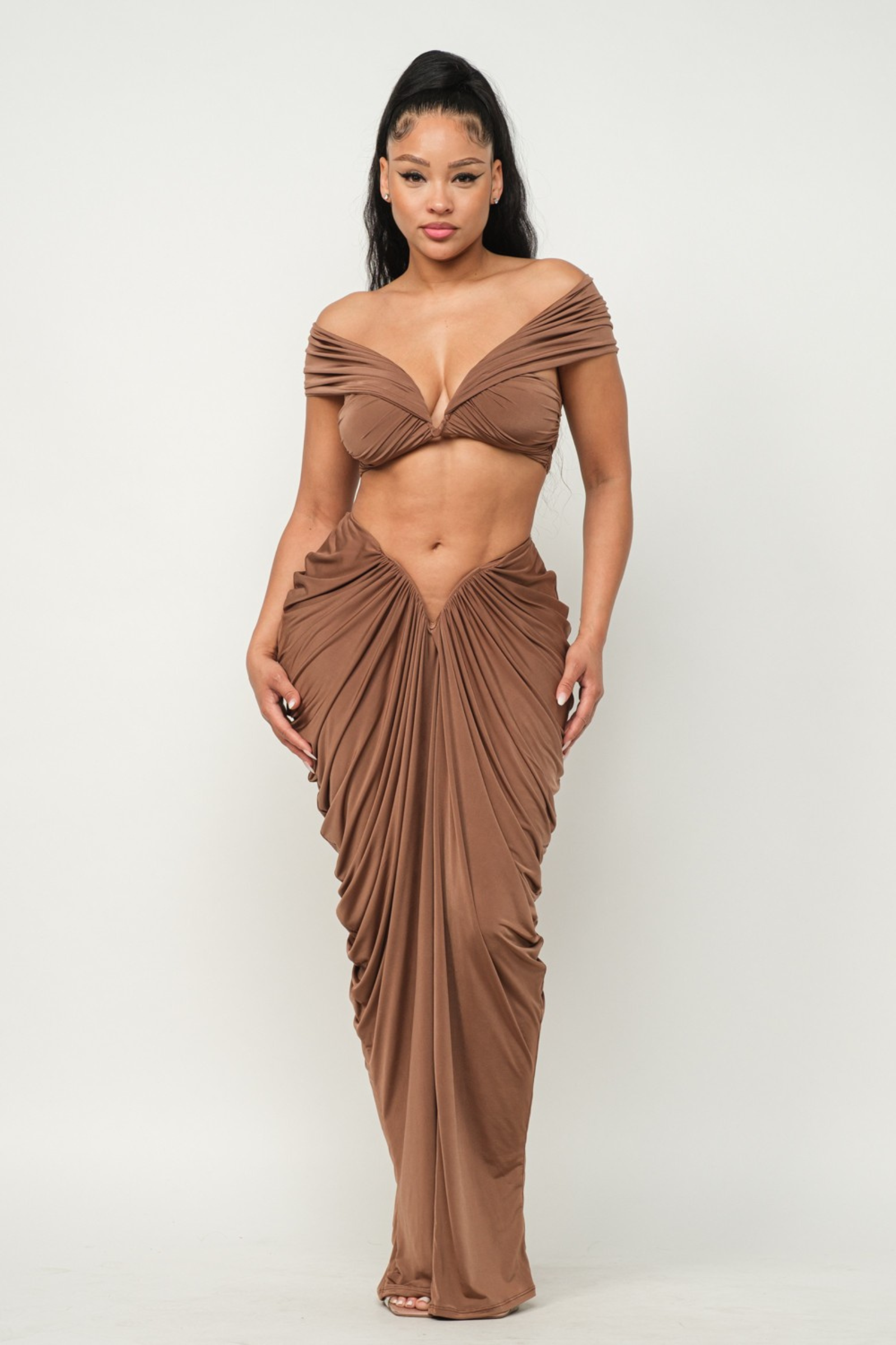 This maxi skirt set is the perfect example of elegance and modern sophistication making it a must have for any fashion forward event.The ruching detail adds so much texture and dimension while enhancing your figure.