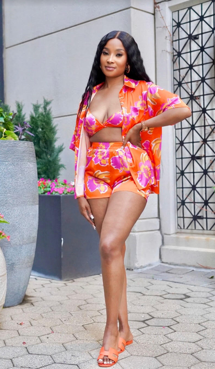Show off those curves in this fashionable 3-piece set! A button-front shirt, bralette with adjustable straps, & elastic waist shorts with pockets - all in a vibrant orange and frushia. Our model is 160lbs and 5'7 wearing a Medium. Go ahead, flaunt it!